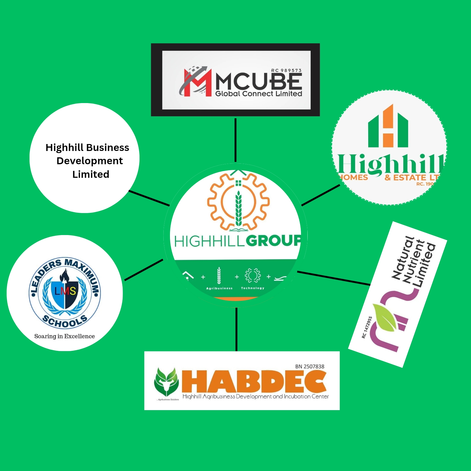 Highhill Group stands as the umbrella company for our diverse but interconnected enterprises: HABDEC, MCUBE, Leaders Maximum Schools, Natural Nutrient Limited, and Highhill Homes & Estate.